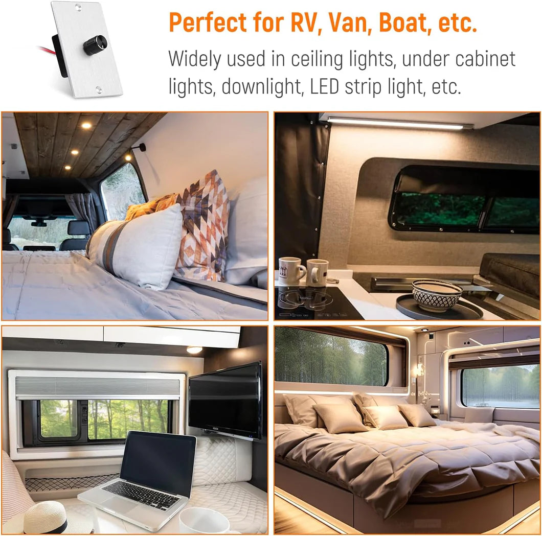 Enhance the lighting in your campervan, RV, boat, truck, or trailer with our 12V PWM LED Dimmer Switch. Featuring a sleek silver panel and a user-friendly rotary knob, this dimmer switch provides smooth, precise control over your LED light fixtures. Designed for both 12V and 24V systems, it ensures efficient and versatile dimming for a variety of lighting applications.