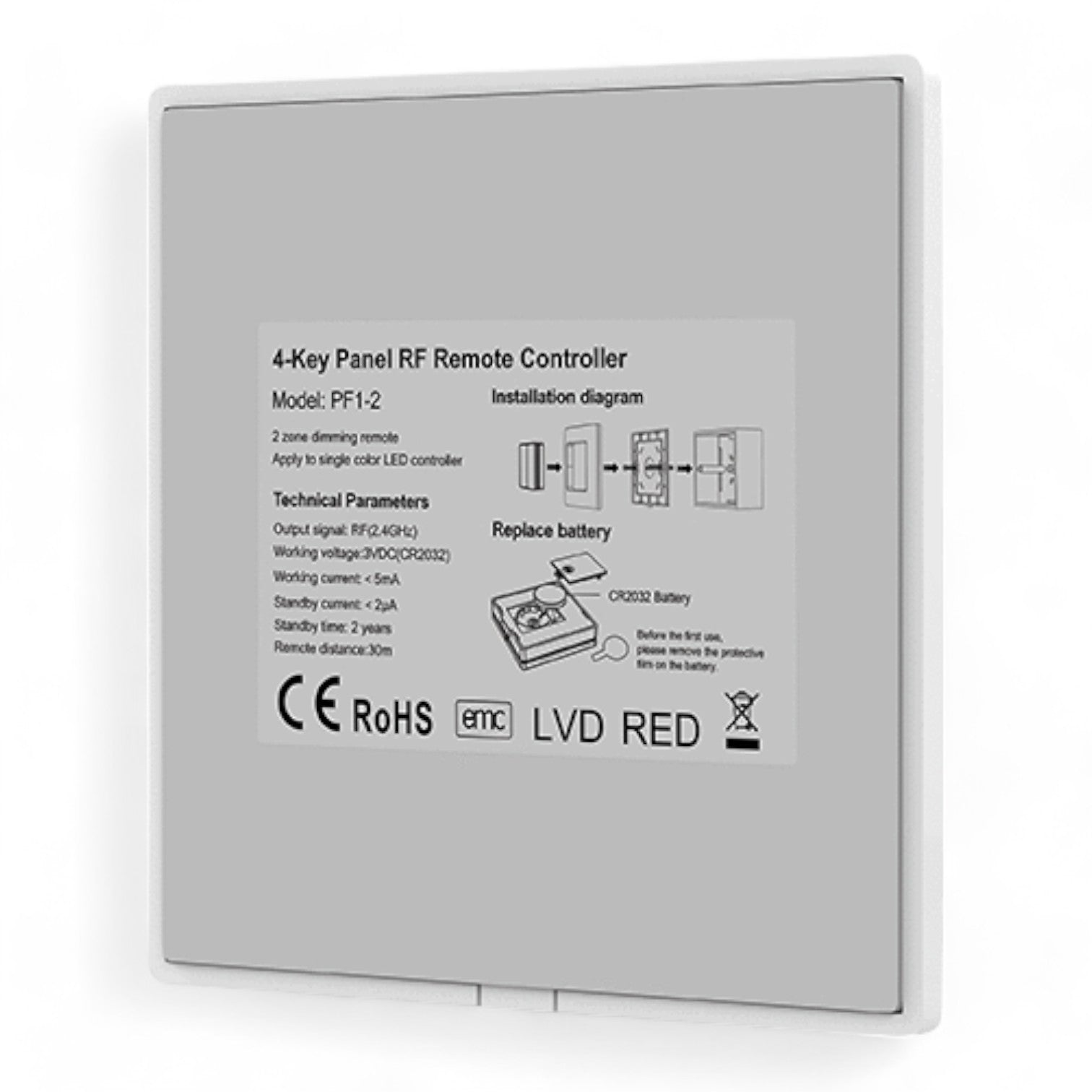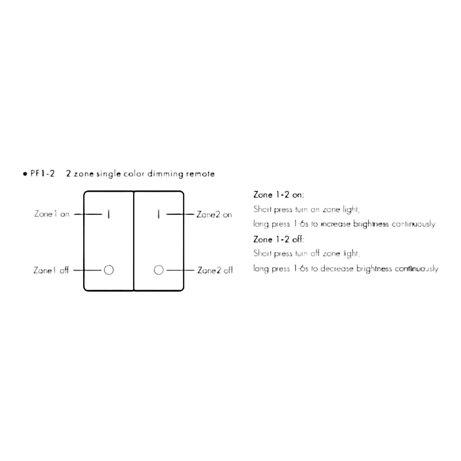 Simplify Your Lighting Control with the PF1-2 Wireless Remote Switch! Upgrade your lighting setup with the PF1-2 Wireless Remote Switch. Ideal for single-color dimming in two zones, it offers convenient wireless control and easy installation. Get yours today and enjoy seamless control over your lighting environment!