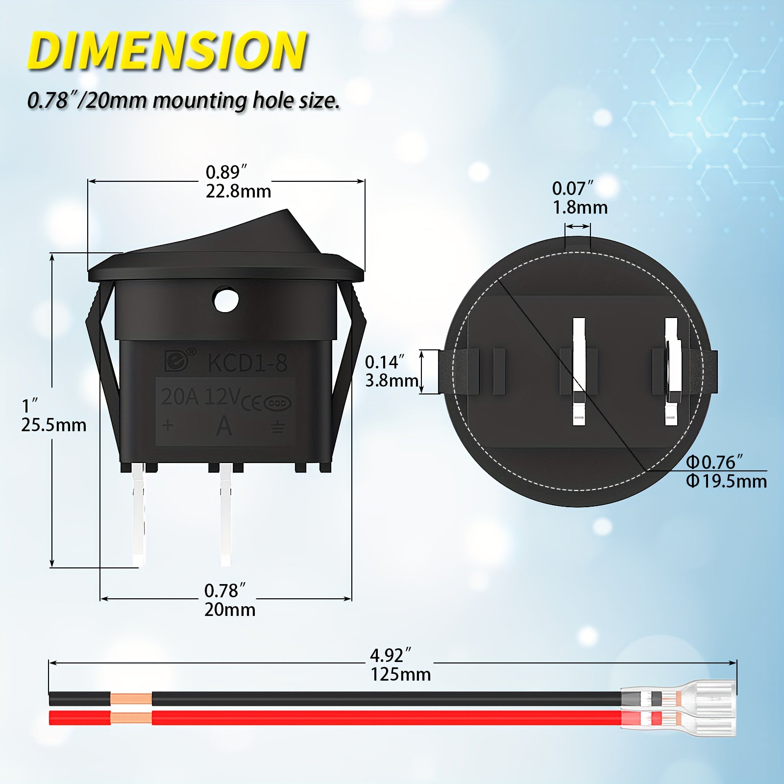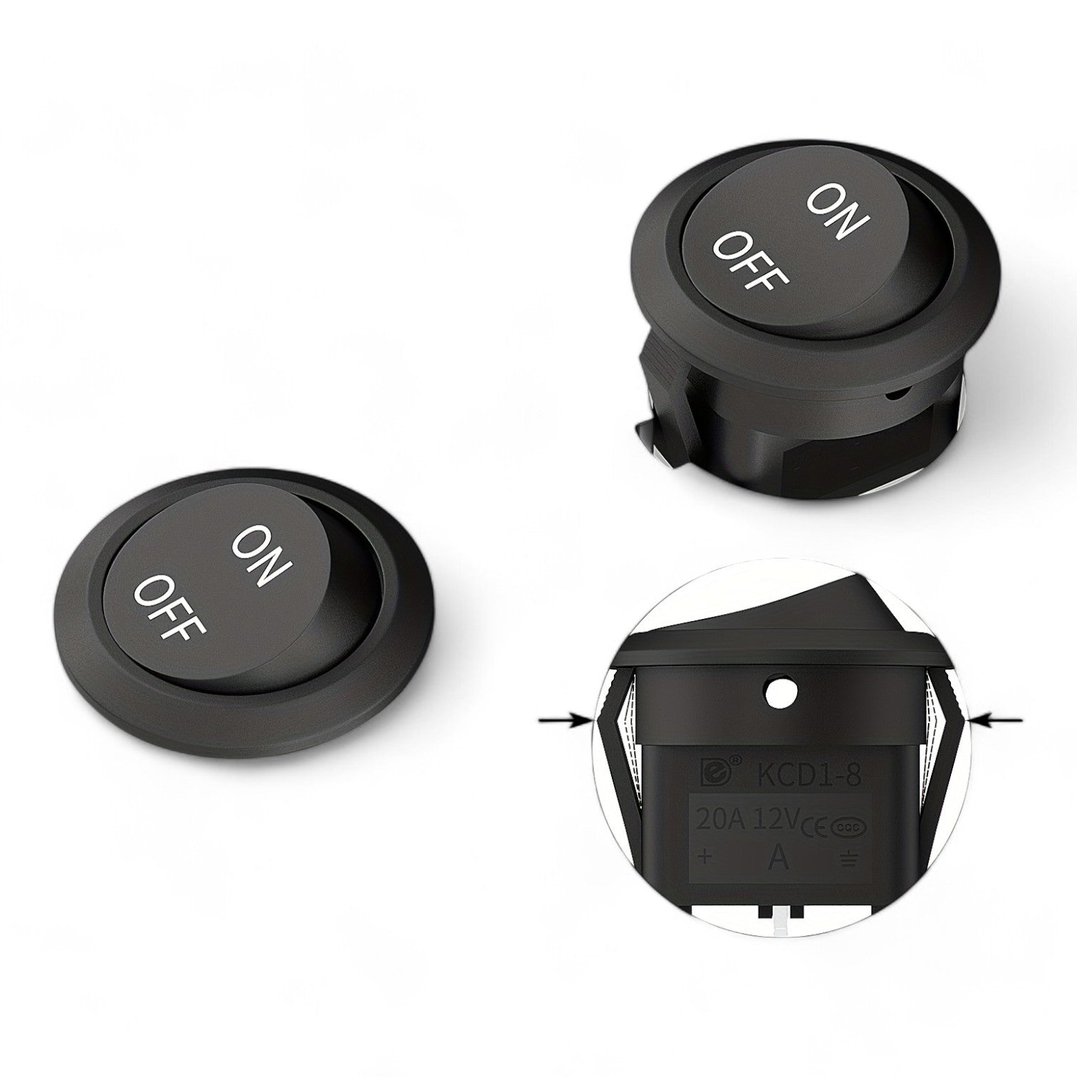 With a 20mm mounting hole diameter, this mini round rocker switch fits perfectly in tight spaces, providing a clean and unobtrusive look. -