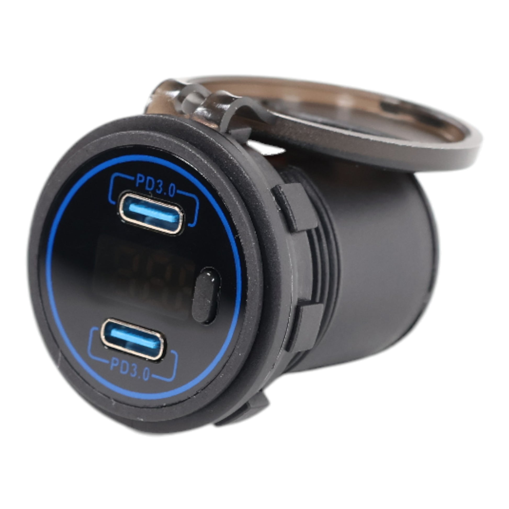 Wire the socket to your 12–24V DC power source, mount it in a 29mm panel cutout, and press the button to activate charging and the voltmeter display. Both USB-C PD ports deliver efficient, high-speed charging to compatible devices.